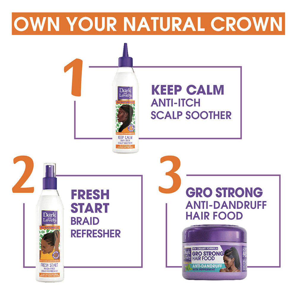 Dark and Lovely Au Naturale Keep Calm Anti-Itch Scalp Soother gently soothes the scalp.