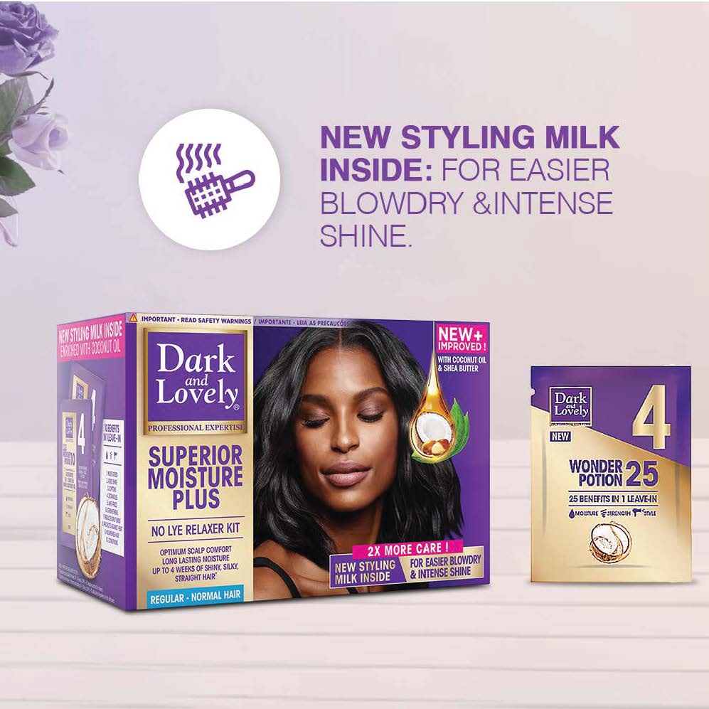 Dark and Lovely Superior Moisture Plus No Lye Relaxer Kit Regular gently relaxes hair for smooth silky, shiny straight hair.
