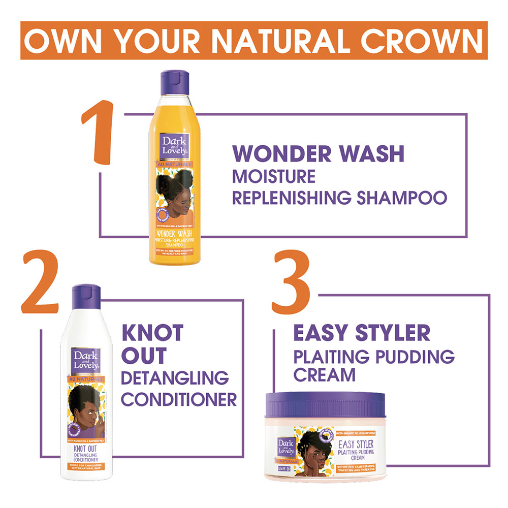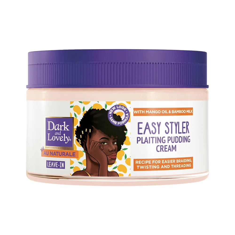 Use Dark and Lovely Au Naturale Easy Styler Plaiting Pudding Cream for defined curly and braided hair styles.